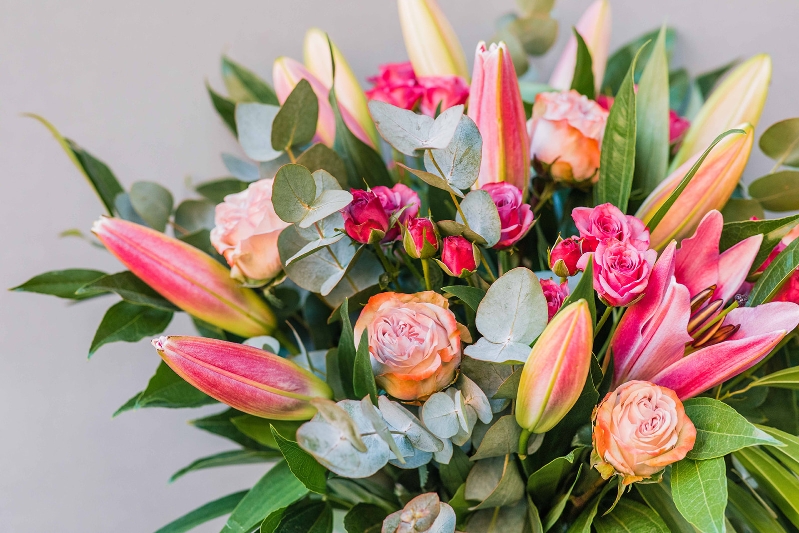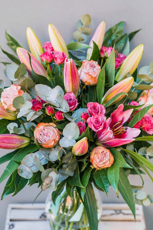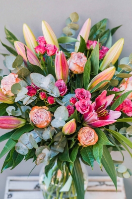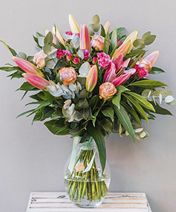 This beautiful mix of lilies and roses is a classic combination. Hand-tied with sumptuous mixed foliage for the perfect finishing touch.